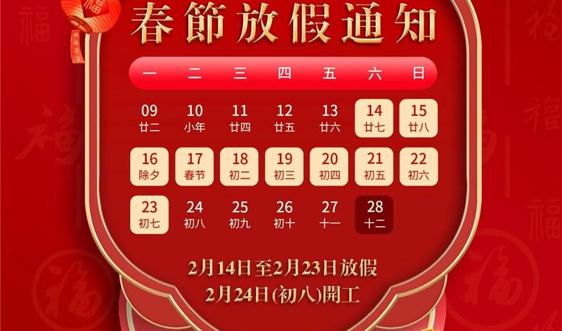 新春佳节将至,衷心感谢您对香港澳华的信任与支持。预祝您阖家欢乐、马年吉祥!我司春节放假安排如下:2026年2月14日-2026年2月23日放假,2026年2月24日(正月初八)正式开工。初八骏启新程,期待与您继续携手,为医院建设事业不懈努力!往期干货:心承家国路..